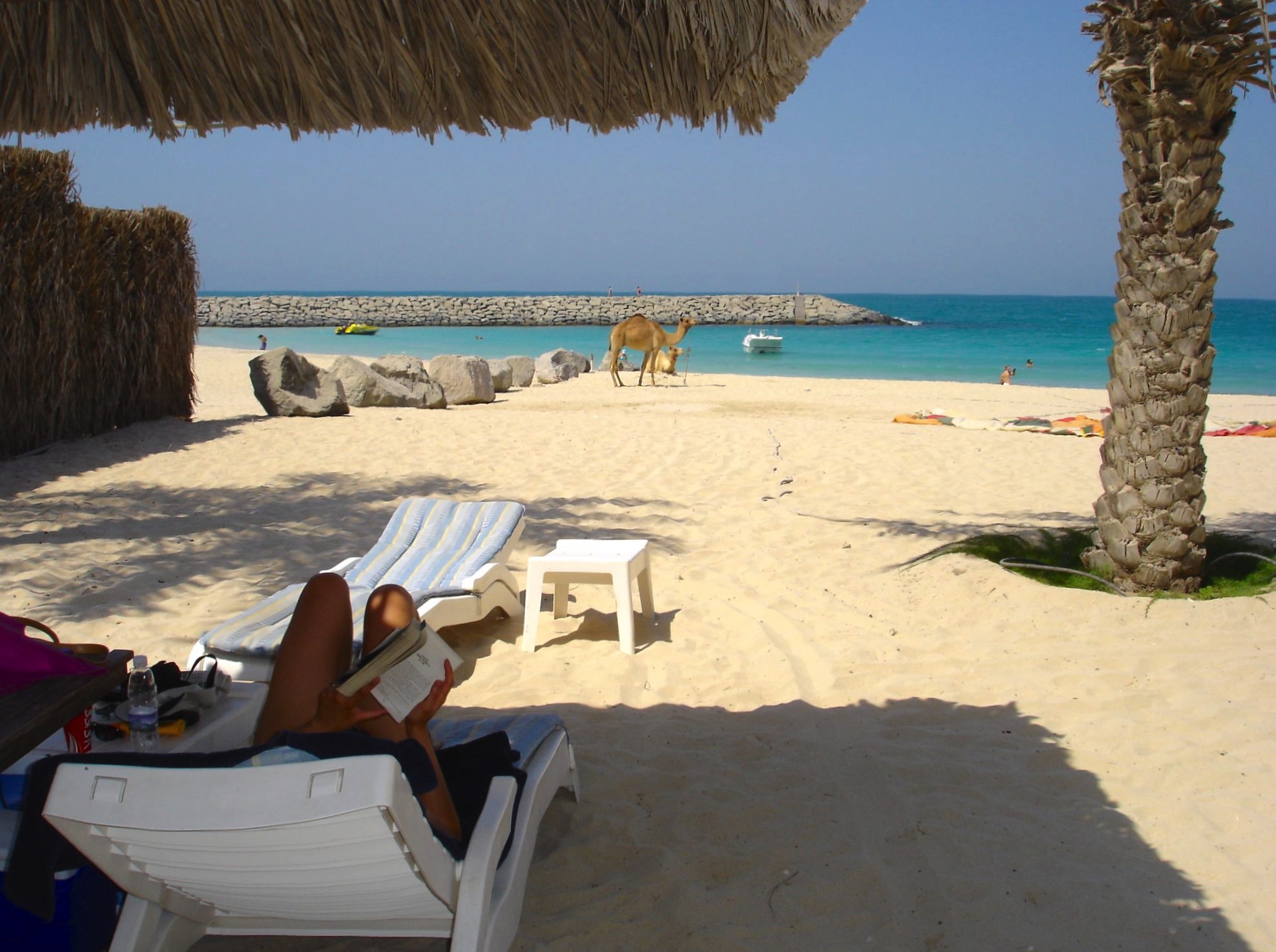 Me reading on the beach as camels look on