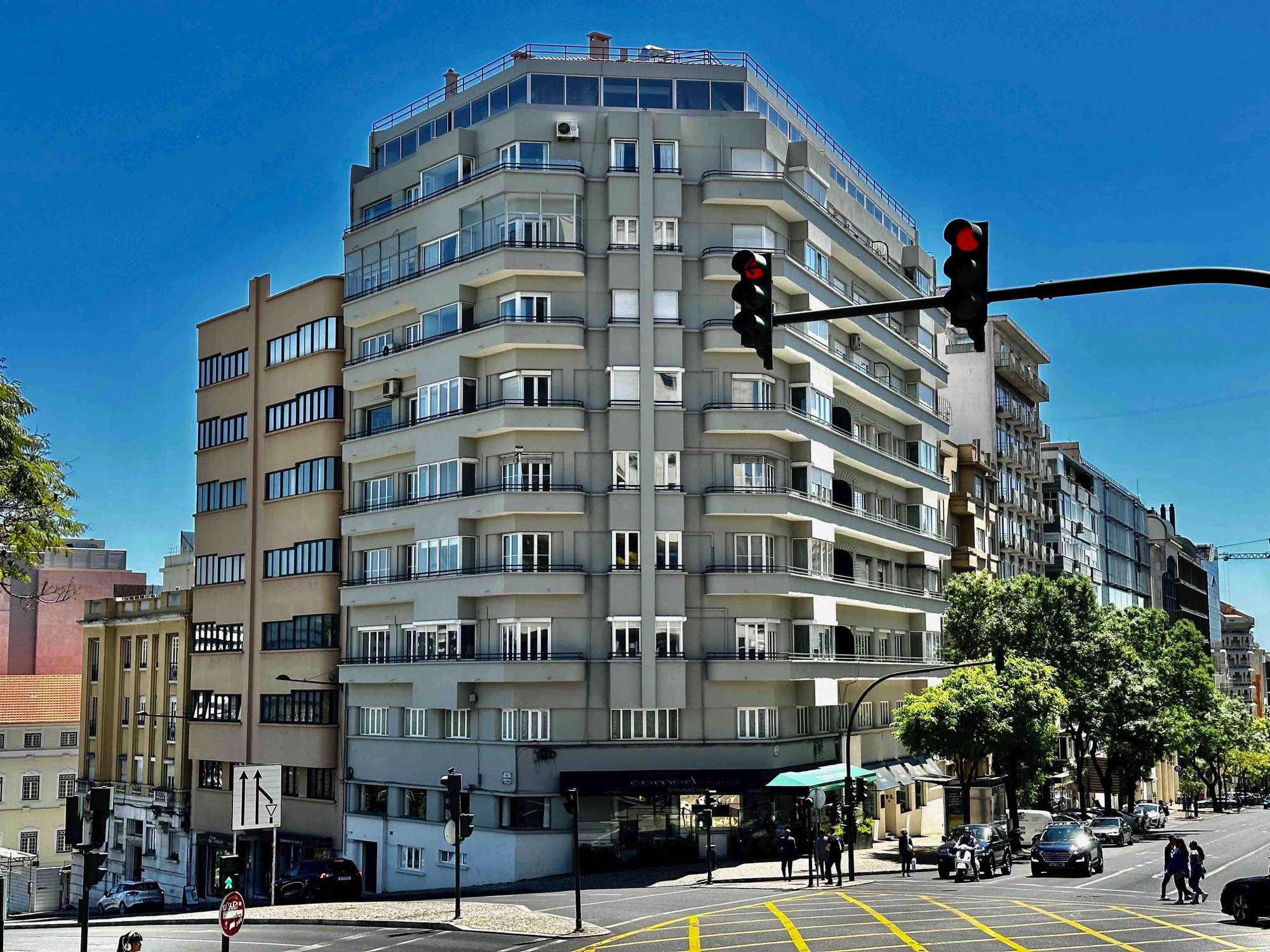 Preserved old buildings and tree-lined median in Avenidas Novas parish