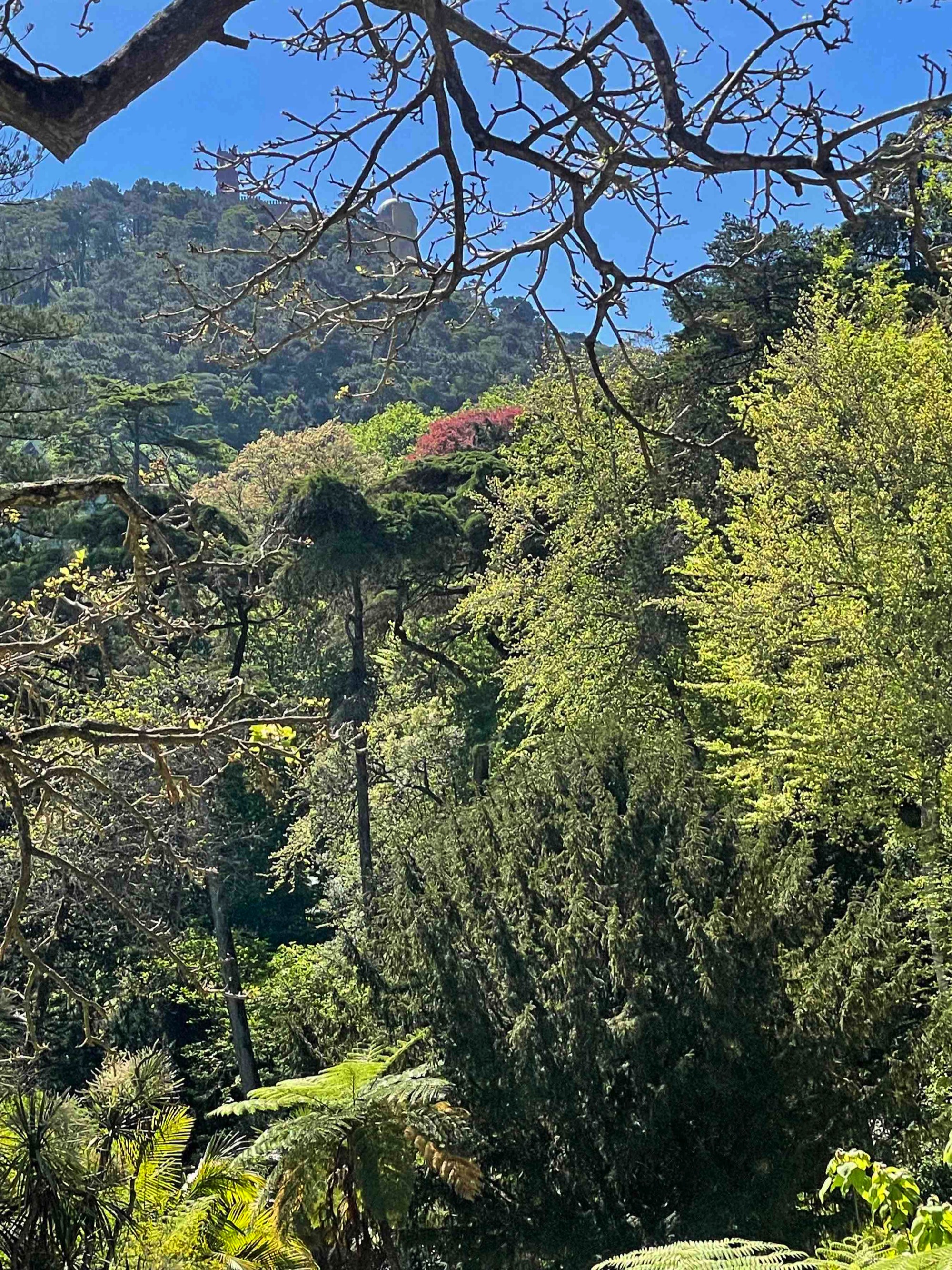 Palace grounds with the Castle of the Moors and Pena Palace on top of the hill visible