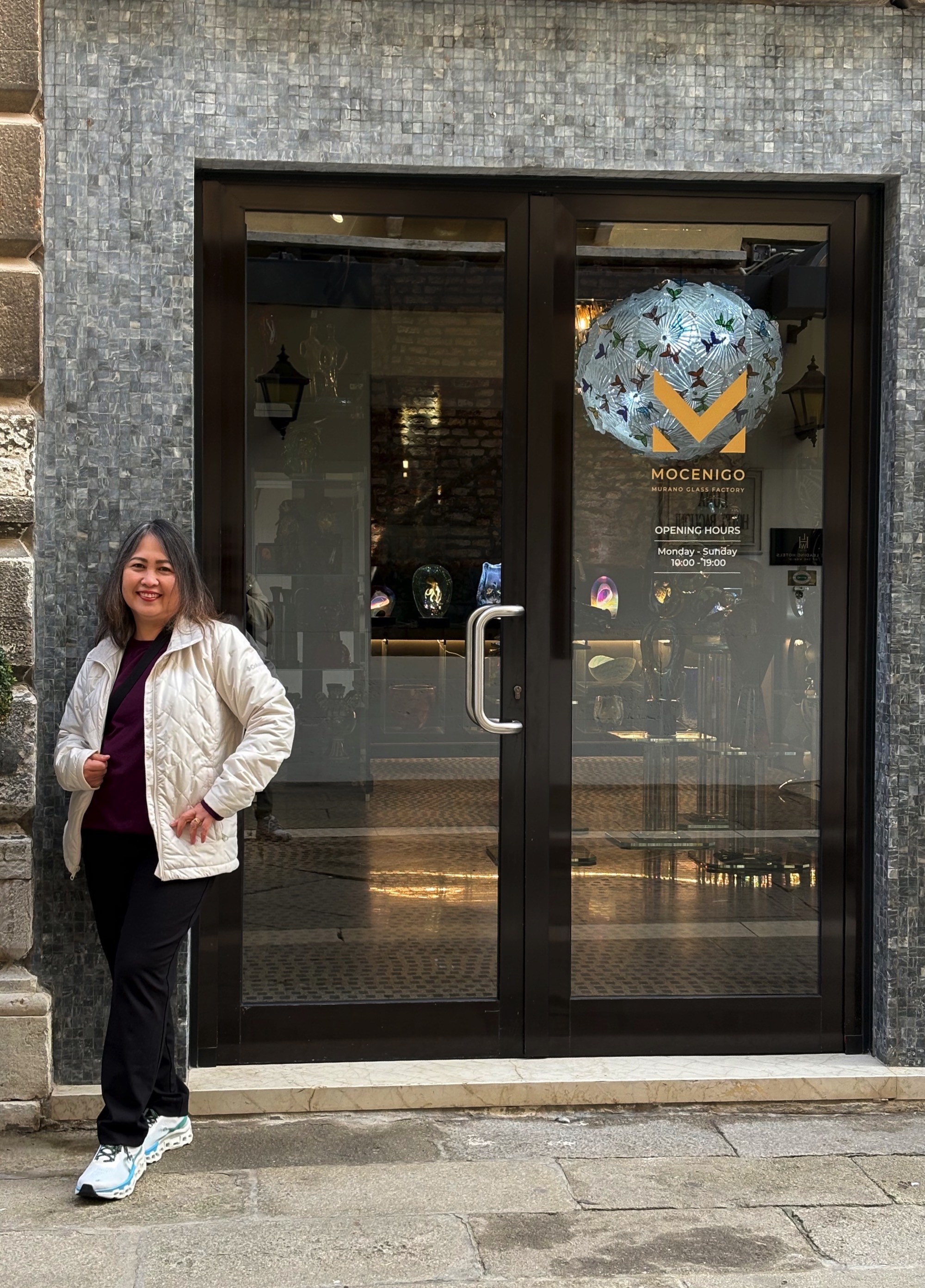 Joe An in front of Mocenigo Murano Glass Factory